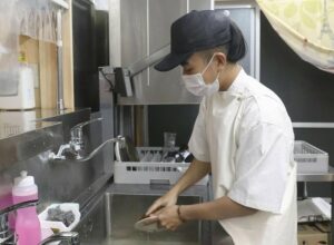 Sinh viên người Việt Lam Nhat Hai làm thêm tại nhà hàng ở thành phố Goto, tỉnh Nagasaki. Ảnh: Kyodo.