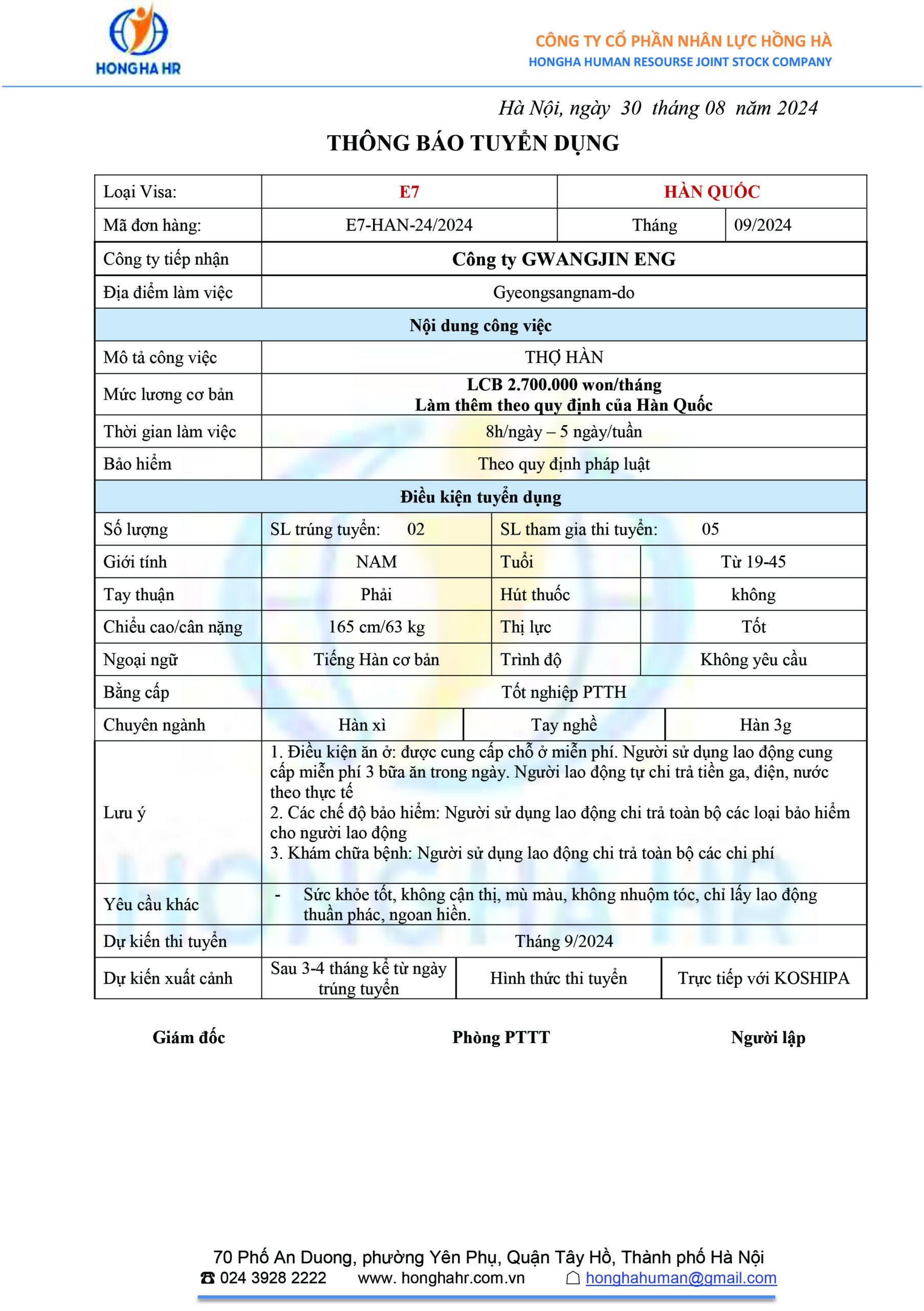 Tuyển THỢ HÀN lao động tại Hàn Quốc Số lượng tuyển: 6 Lương cơ bản:...