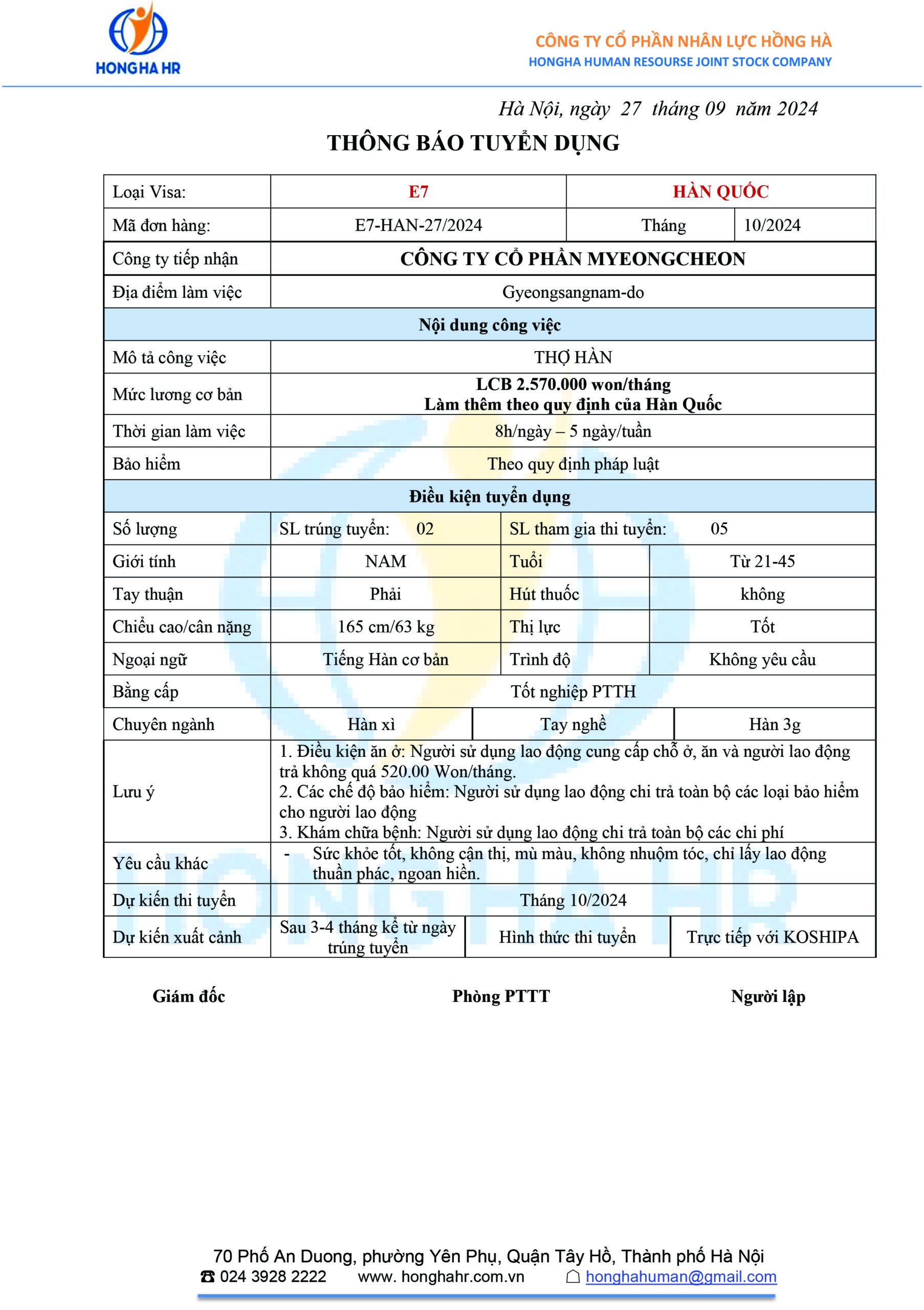 Tuyển THỢ HÀN lao động tại Hàn Quốc Số lượng tuyển: 20 Lương cơ bản:...