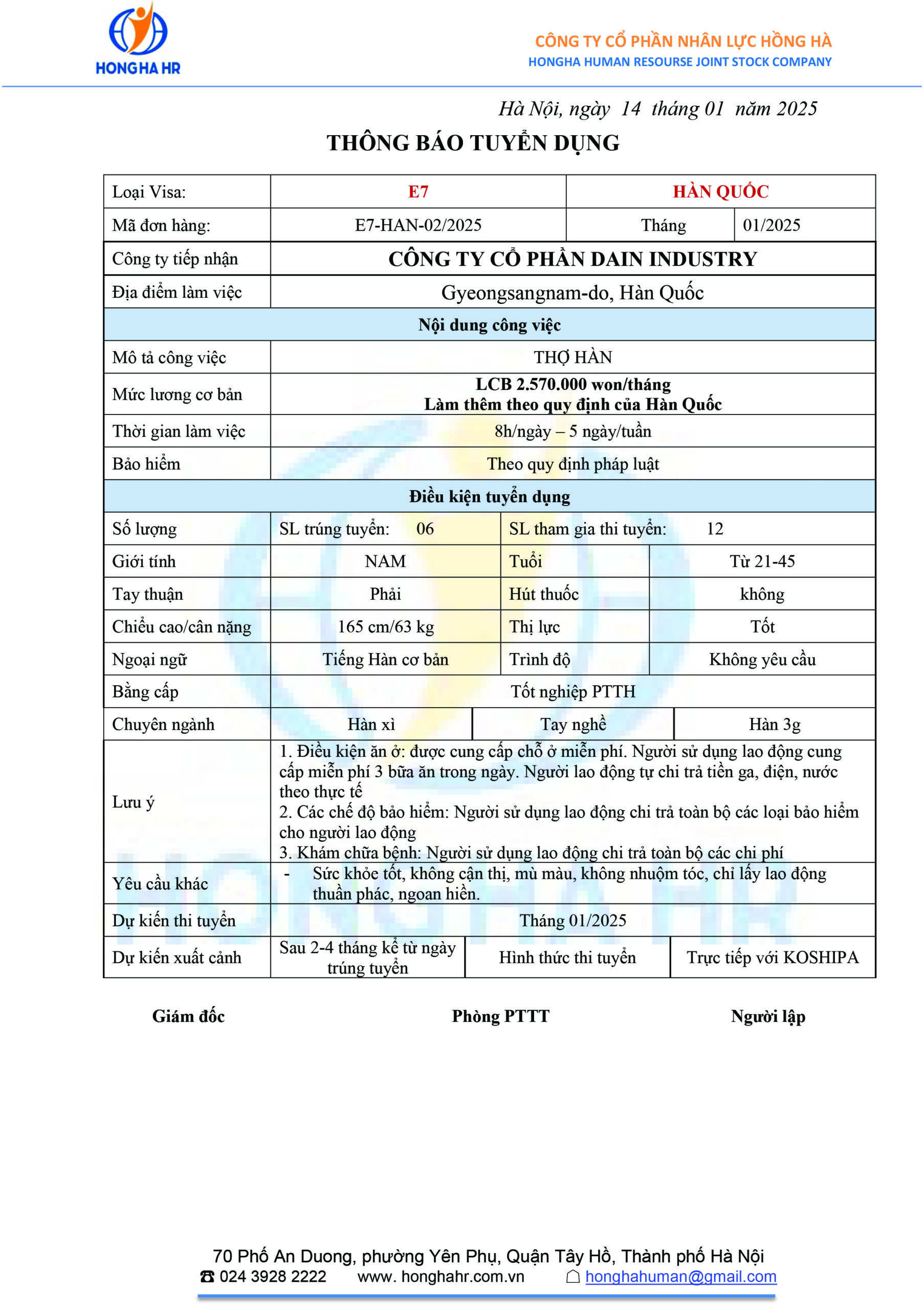 Tuyển THỢ HÀN lao động tại Hàn Quốc Số lượng tuyển: 6 Lương cơ bản:...