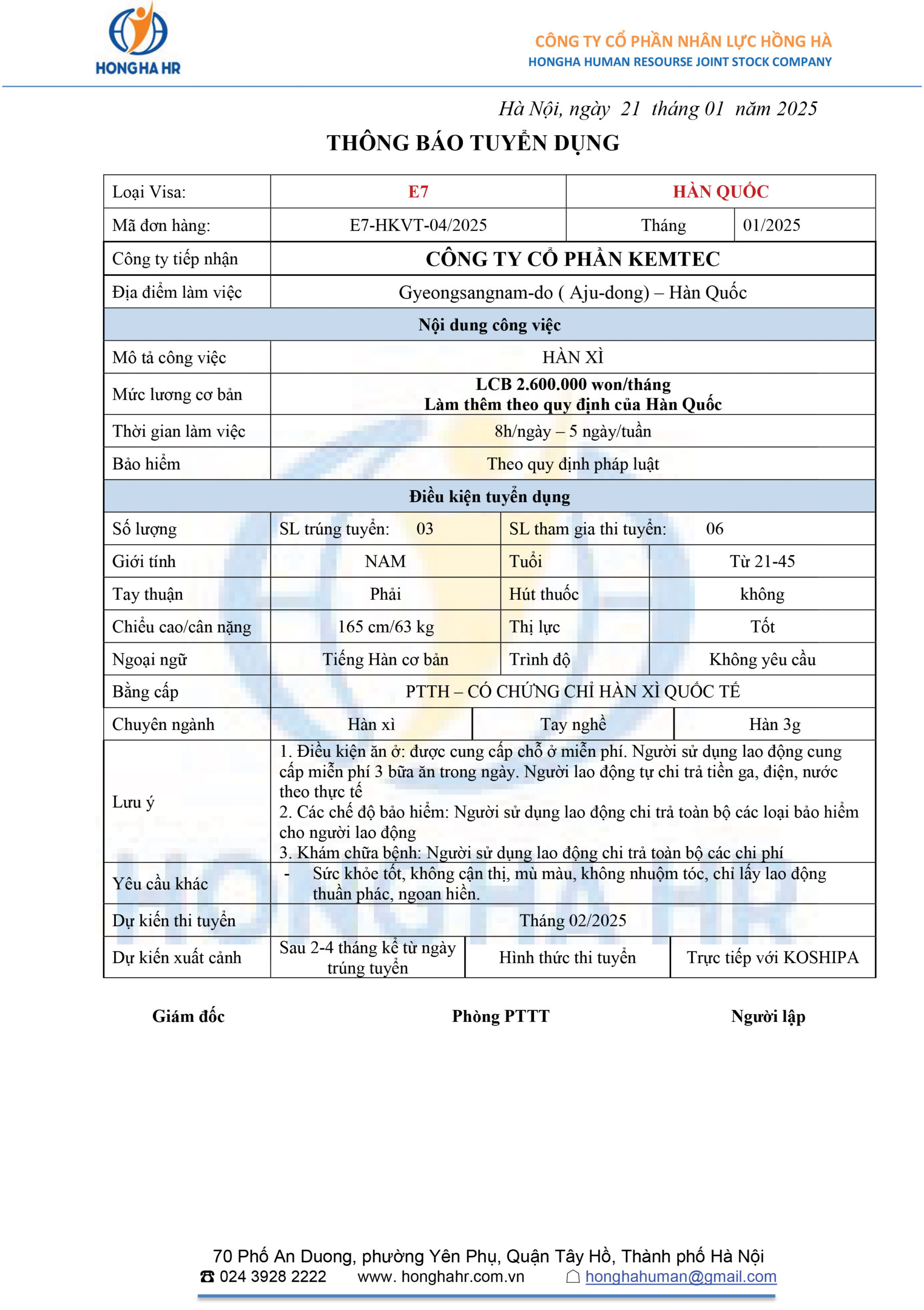 Tuyển THỢ HÀN lao động tại Hàn Quốc Số lượng tuyển: 20 Lương cơ bản:...